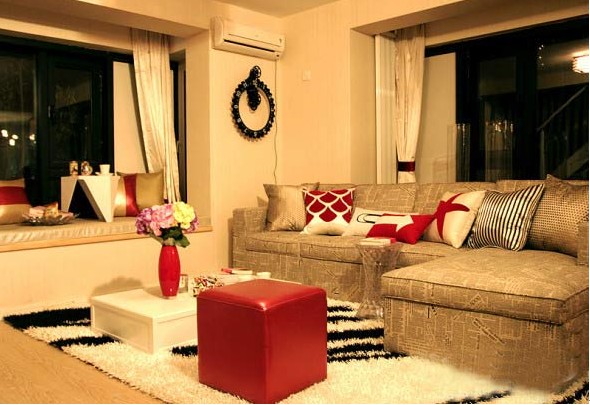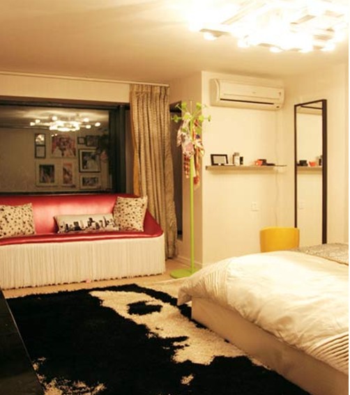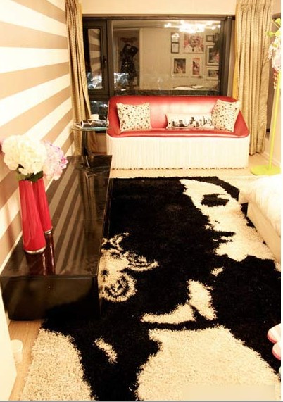 臥室地毯讓我眼前為之一亮,黑白搭的女人造型,時尚,前衛(wèi)又不是檔次。喜慶的沙發(fā)給這個角落到來來點**。