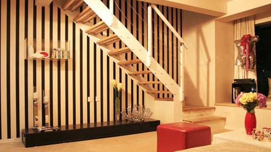 樓梯下面用做電視背景墻,有點小別墅的調(diào)調(diào)。但是黑白條紋的搭配作為電視背景墻,容易渙散別人的注意力,建議大家,電視背景別弄的太花俏。