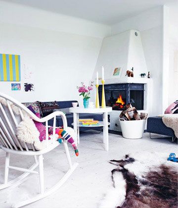 墻面與地地板都選用了白色,搭配的色彩相當(dāng)?shù)暮啙崳@大范圍的運(yùn)用了白色,讓人感覺置身于寒冷的北歐,看看這歐洲風(fēng)格的壁爐給這簡潔的家加分不少,還有毛絨的地毯與椅墊,讓人感覺這家溫暖了許多。