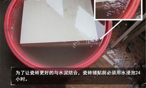 鋪貼瓷磚時(shí),瓷磚與墻面的貼合度要大于自身產(chǎn)生的重力。因?yàn)榇纱u本身有許多小孔,吸水能力強(qiáng),干燥的瓷磚會(huì)吸干水泥的水分,使其貼合度降低,鋪貼后易出現(xiàn)空鼓和脫落。因此瓷磚必須浸泡24小時(shí),至無水泡出現(xiàn),然后晾干再鋪貼。