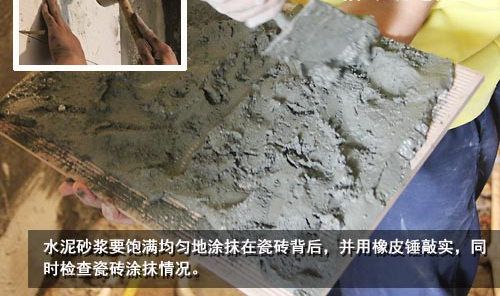 瓷磚鋪貼時(shí),水泥砂漿的濕度要把握好,太干或太濕都會(huì)影響瓷磚與墻面的粘合度。水泥砂漿需要均勻飽滿地涂抹在瓷磚背后,避免只涂抹四周。瓷磚貼墻后,需用橡皮錘敲實(shí),同時(shí)要檢查瓷磚涂抹情況,及時(shí)添加或減少水泥,這一工序需要反復(fù)進(jìn)行,至瓷磚與墻面均勻貼合為止。
