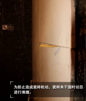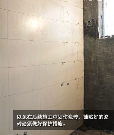 鋪貼瓷磚后,還會(huì)進(jìn)行一些后續(xù)的工程,為避免在施工中劃傷瓷磚,墻面鋪貼完成后必須對(duì)鋪貼好的瓷磚進(jìn)行保護(hù)??稍趬w下方的瓷磚鋪上包裝箱,在移動(dòng)衛(wèi)浴用具和施工工具時(shí),避免碰到磚面。