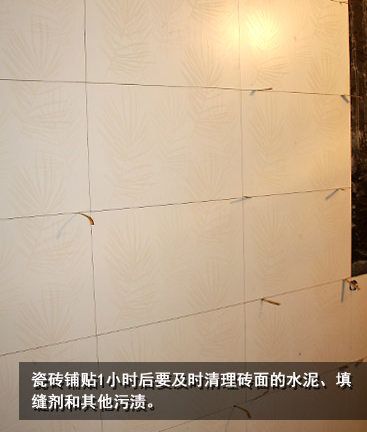 瓷磚鋪貼1小時(shí)后,要用毛巾將磚面的水泥、填縫劑和其他污漬清理干凈。切勿在事后再用鋼絲球清潔,這樣容易損壞磚面。
