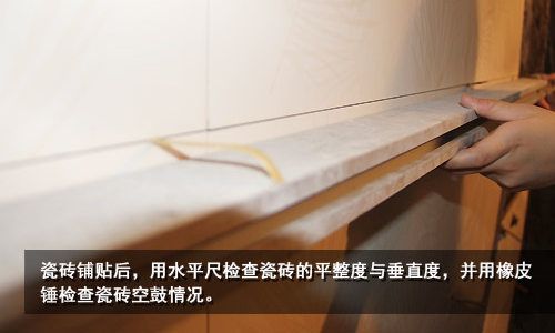 鋪貼完成12小時(shí)后,可用水平尺檢查墻面的平整度與垂直度,并用橡皮錘敲擊瓷磚,檢查么快磚的空鼓情況,發(fā)現(xiàn)空鼓要立即返工。