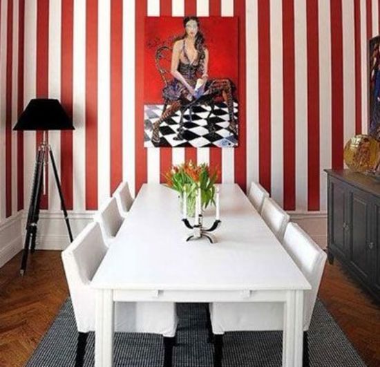 到了以熱情如火的紅色為主題的空間—飯廳了。紅白相間的壁紙,表達(dá)紅色的熱情之余,用白色的冷靜來平衡調(diào)和,減低紅色給人的壓迫感,同時(shí)也是另一個白色空間的過渡。值得注意的第一點(diǎn),是壁畫的選擇,壁畫上的黑白地板瓷磚是不是很熟悉呢?