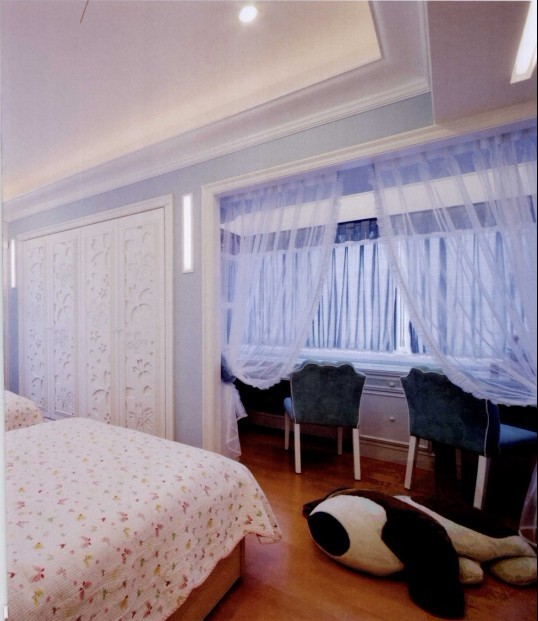 重點(diǎn)2 讓收納更有效率的女孩房 兩個(gè)可愛的女兒平時(shí)就很喜歡黏在一起,所以媽媽決定將兩個(gè)安置同一個(gè)房間,好在二樓的空間也足夠,選用采光極好的空間,將原有的小房間也劃入正好將房間擴(kuò)大。兩個(gè)女兒即將上小學(xué),所以在房間內(nèi)特別隔出一個(gè)閱讀區(qū),以白紗作為裝飾,將平時(shí)上學(xué)用的學(xué)習(xí)用品收納在這里,至使臥室并不顯得亂。