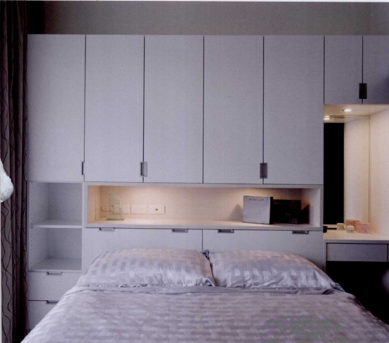 主臥空間有限,設(shè)計(jì)師利用床頭空間規(guī)劃床頭柜,并全都采用系統(tǒng)柜,左邊為展示型的收納柜,右邊是梳妝臺(tái)。特別選用霧面白色木紋門片,提升空間質(zhì)感。