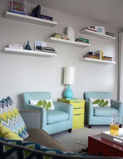 客廳除了灰色,藍(lán)色和黃色是家具選擇的重點(diǎn),長(zhǎng)沙發(fā)用深一點(diǎn)的灰色,單人沙發(fā)和收納柜則分別選用了長(zhǎng)沙發(fā)抱枕上的藍(lán)色和黃色相同的顏色讓客廳的灰色、藍(lán)色和黃色巧妙地展現(xiàn)同一個(gè)主題。墻壁上加上置物板,活用上層的空間,同時(shí)也能讓設(shè)計(jì)更加立體,呈現(xiàn)多種線條和顏色的變化。