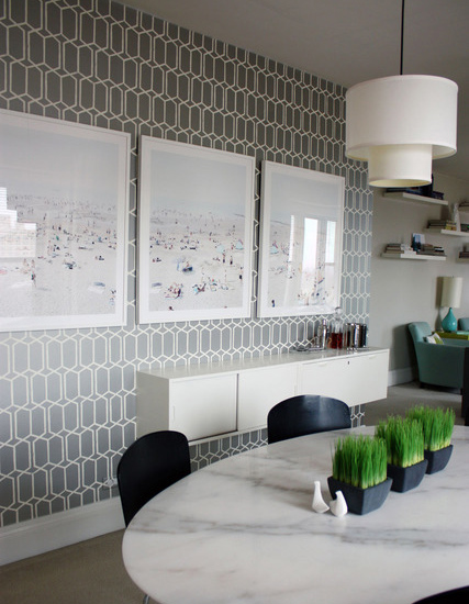 飯廳的位置則貼上了灰色、白色相間的蜂巢狀壁紙,用掃描畫加以裝飾加上白色儲(chǔ)物柜,隔開大塊的白**塊,將眼花繚亂的壁紙變得更加合理。大理石餐桌上灰色的石紋,更近一步地將“灰色“演繹得淋漓盡致。搭配桌上綠色小盆栽,營(yíng)造淡雅自然的飯廳,人在享用餐飲的時(shí)候能更加放松心情。