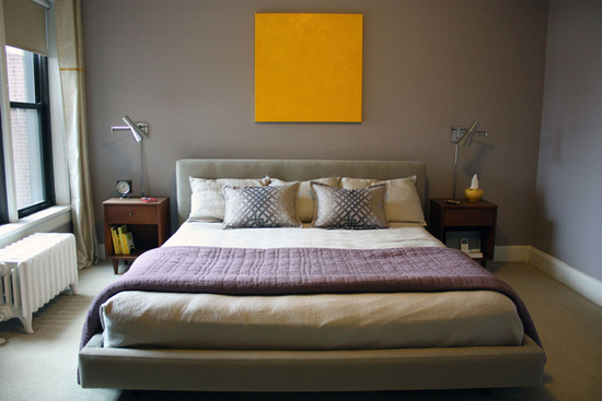 寢室和其他空間一樣,用灰色奠定了裝修的主基調(diào),墻壁、床架、被套、抱枕、地毯都是或深或淺的灰色。在一大片灰色的空間,用鮮黃色放在床頭側(cè)墻壁的正中央,給人以輕松樂(lè)觀的積極向上感,也將人的視線迅速聚集到一個(gè)焦點(diǎn)。