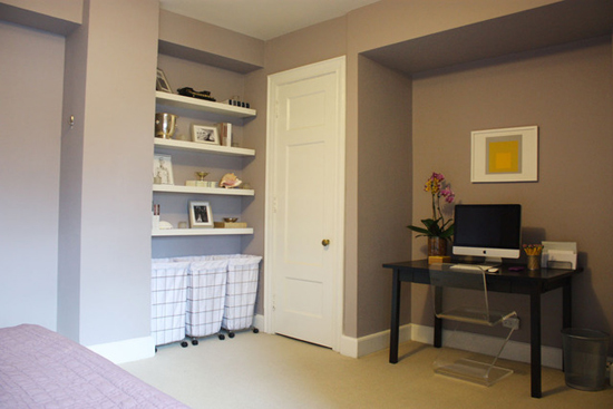 寢室活用了房?jī)?nèi)柱子和墻壁之間的空間,加搭置物板,將凹進(jìn)去的空間變成書柜。比較大面積的凹位,可以放書桌和椅子,變成書房。這里電腦上也用小片的鮮黃色來(lái)呼應(yīng)它對(duì)面的鮮黃色。