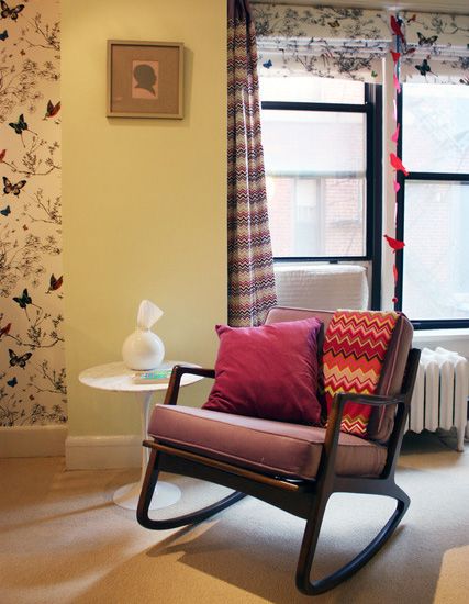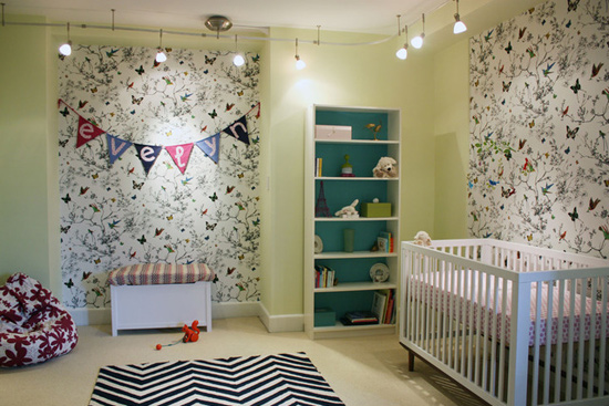 用灰色線條加上五顏六色的蝴蝶裝飾的壁紙將米白色的嬰兒房墻壁營(yíng)造出清新自然又開闊的空間。加上黑白波浪花紋的地毯,將平面變成立體的設(shè)計(jì),增加顏色和設(shè)計(jì)的層次。書柜里側(cè)的藍(lán)色則保持了客廳和寢室顏色上的聯(lián)系。