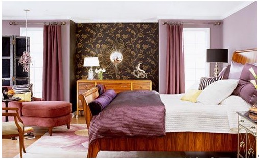 臥室也運用了高貴的紫紅色,盡顯出室內(nèi)的華貴,配上富有質(zhì)感的家具,令臥室如豪華酒店套房般品位。金色的植物圖案的壁紙搭配深紫色墻面,混搭的效果凸顯出墻面的立體感,而大量的銀色金屬元素,與艷褐色睡床座椅、以及木質(zhì)紋理的地板都彰顯出低調(diào)的奢華感。地面鋪設(shè)的花瓣地毯融合了深淺多種的紫色調(diào),襯托出洋紅色扶手椅和高貴的紫色綢緞。頂部粉紫色水晶燈飾,營造愜意舒適的氛圍。