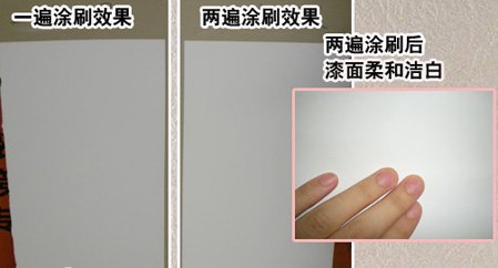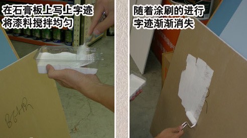 此款涂料可以免底漆涂刷,不過建議在施工過程中須涂刷兩遍以確保達到最佳效果,從而保持墻面的耐久性。我們現(xiàn)場做了如下實驗,找來兩款石膏板,在一張石膏板上面不用底漆直接涂刷一遍,在另外一張石膏板上面不用底漆直接涂刷兩遍。