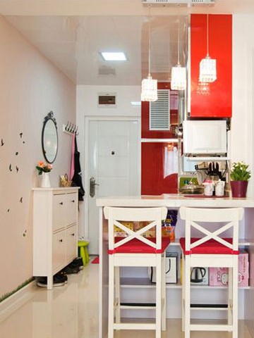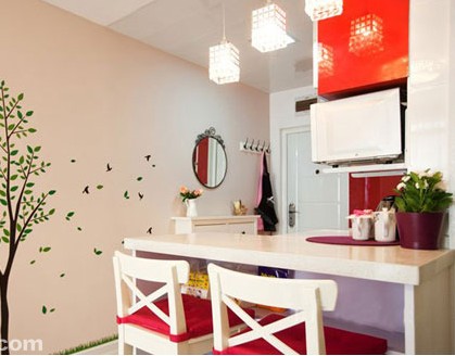 利用廚房的一旁定做一個小吧臺,這樣就能成為小夫妻的就餐區(qū)域了,高吧臺的設(shè)計,在下方做上擱板就能成為收納的空間,椅子上的軟墊,增加了舒適度。過道一側(cè)的墻面手繪上了一顆小樹,提升了小空間的氣質(zhì),給房間帶來大自然的氣息,小戶型一樣可以富有藝術(shù)氣息。