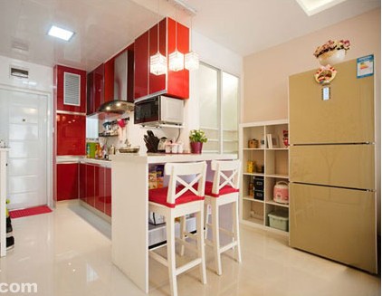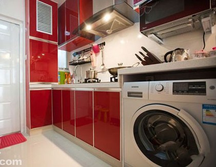廚房設(shè)計在門的右邊,將其設(shè)計成了開放式的,在視覺上讓你感覺到十分的寬敞。紅色的櫥柜也增加了婚房的喜慶氣氛。紅色的烤漆柜門面板很亮眼。嵌入式自動洗衣機收納到柜體內(nèi),合理地利用了空間。吊櫥下安裝了擱板,將微波爐擺放其上,借取了縱向的空間。