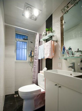 衛(wèi)生間空間比較狹小,改有的東西一樣不缺,足夠滿足小夫妻的日常需求。大面的鏡子能增加空間的寬敞感。鏡子下方的玻璃擱架可放置洗漱用品,臺盆下的浴室柜則成為很好的收納之所。小小的空間內(nèi)配上了大大的花灑,最大限度地增加了沐浴的舒適度。