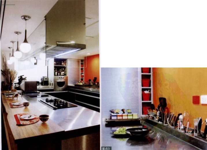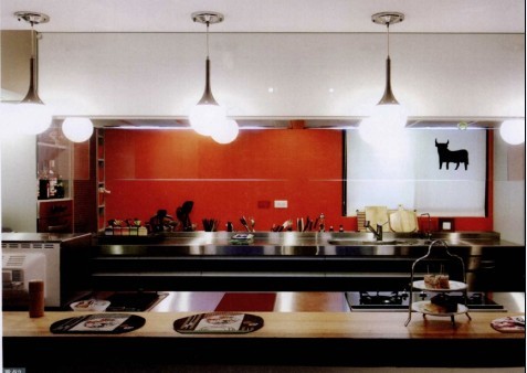 以日式居酒屋為概念設(shè)計(jì)的廚房吧臺(tái),讓屋主可以邊下廚連跟朋友聊天??紤]到廚具以不銹鋼為主,為化解冰冷感,特別以紅色來中紅。而廚房的電器,都以嵌入為主。