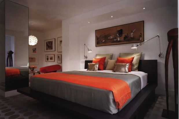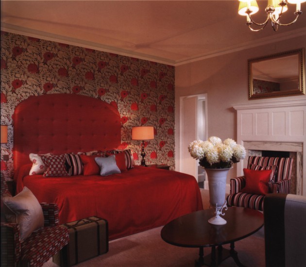 這是一個(gè)暖色的美式臥室,壁爐做為裝飾品出現(xiàn)在這里。色彩是室內(nèi)裝飾中永恒的主題,對(duì)于床的裝飾設(shè)計(jì),色彩的應(yīng)用往往也能夠營(yíng)造出意料之外的效果。在這個(gè)空間的設(shè)計(jì)中,紅色的床單、床頭以及壁紙的設(shè)計(jì)使空間變得熱情四射。