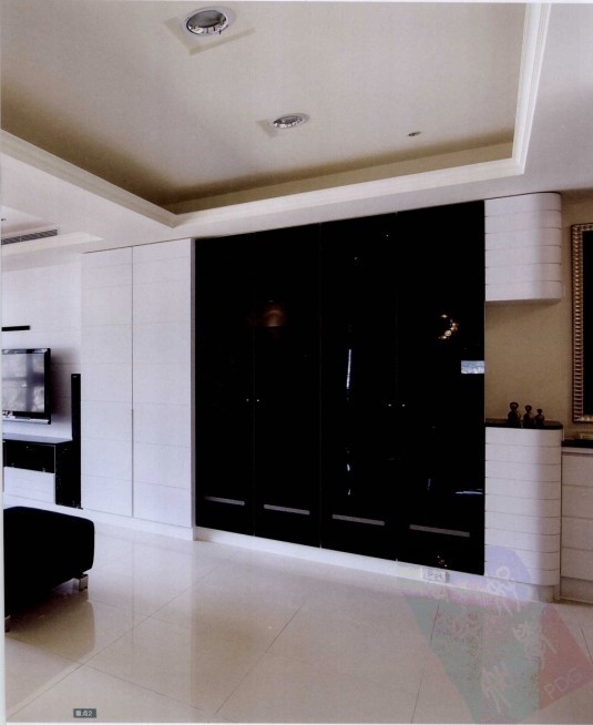 概要: 為了滿足戶主大量地收納物件需求,設(shè)計(jì)師沿壁面規(guī)劃了大量的隱藏式收納柜。以黑色與白色為空間主題,柜體以白色為主,輔以各種黑色建材,以提升空間質(zhì)感,而充滿前衛(wèi)感的黑色烤漆與黑色鏡面則帶來(lái)時(shí)尚感,展現(xiàn)出低調(diào)奢華的氛圍。此外,黑白之中并適度地穿插少時(shí)的銀色或透明色,如入門玄關(guān)鞋柜上的玄關(guān)穿衣鏡,配以造型利落的銀色鏡框,又如餐廳與廚房之間采用玻璃拉門區(qū)隔。