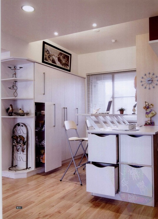 這個(gè)家的收納空間以廚房吧臺(tái)為中心,兼具了強(qiáng)大收納功能與獨(dú)特造型的寬闊吧臺(tái),讓人完全無(wú)法想象定制柜的強(qiáng)大。此外,設(shè)計(jì)師帶著業(yè)主MM跑了好幾天的建材市場(chǎng),MM也掌握了定制家具的可以隨心所欲的百變特質(zhì),預(yù)留了一個(gè)直立式冂形區(qū)域,將新購(gòu)的餐桌隱身于吧臺(tái)內(nèi),依需求而收放。美式鄉(xiāng)村風(fēng)格的白色系統(tǒng)柜,美化了整個(gè)空間協(xié)調(diào)了空間的每一個(gè)元素。