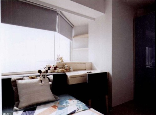 臥室由結構產(chǎn)生了畸零空間,設計師因此在窗前設計書桌,再利用階梯的概念將收納柜體向上延伸,將空間難題完美地解決。