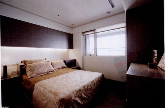 臥室的床頭上方有壓梁的問題,設計師在此配置了吊柜,將梁柱隱藏起來,吊柜下方安裝燈光,減輕柜體的重量感,讓臥室更加舒適。