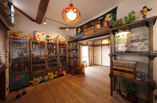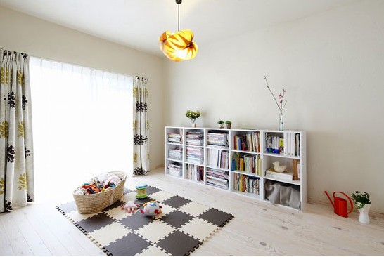 外部造型似向日葵的吊燈,樣式別致,散發(fā)的燈光柔和不會讓人覺得耀眼。深棕色的百葉窗與木質(zhì)地板和儲物柜一起營造出夢幻般的溫馨世界。門兩側(cè)的多層開放式儲格,為體積不同的模型分別找到了安放之處。而開放式的形式,也增加了空間的利用度。頂層擺放多個(gè)玩偶模型,既讓孩子覺得生動有趣,又會降低木質(zhì)材料帶給孩子的壓迫感。