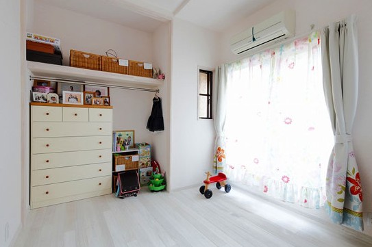 白色的薄紗窗簾使房間內(nèi)的陽光不再耀眼,印花的圖案也讓孩子們非常喜歡。而選用白色的地板來提高房間的明亮度,又能營造出輕松舒適的氛圍。利用房間的凹凸度,打造出一個(gè)小型的儲物場所。隔板上面擺放幾個(gè)竹編的儲物筐,放些不太常用的物品。下方只用一根鋼管便變成了簡易的衣架,既簡便又非常有實(shí)用性。乳白色的儲物柜,收納功能強(qiáng),又可使物品分類擺放便于翻找。再擺放幾張溫馨的全家福照片,這樣的空間,孩子怎么會不喜歡呢!