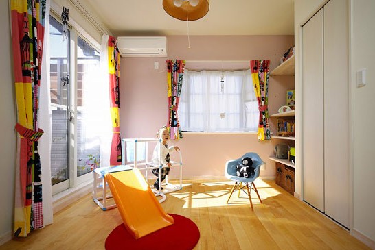 粉色的墻壁打造出柔和輕松的基調(diào)。紅黃色相間的卡通窗簾,很符合孩子們的口味,也讓空間的顏色變得不再單一。因?yàn)榉块g面積有限,角落用隔板改造成開放式的儲物區(qū)域,既不會顯得空間沉悶,也避免了玩具過多帶來的凌亂。房間中央擺放了孩子喜歡的小滑梯,可愛的玩偶,色彩鮮明,童趣十足。