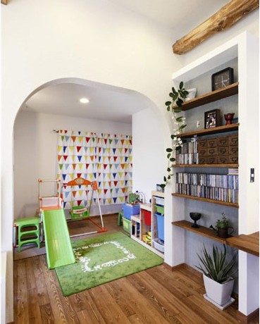 開放式的拱形門,既不會讓空間的過渡變得突兀,又很好的增加了房間的延伸度,不會給人狹小的感覺。柔軟的綠色地毯既與小型的滑梯和秋千色彩融合,也增添了孩子玩耍時(shí)的安全感。彩色旗幟的窗簾頗具特色,既有實(shí)用性,也符合了孩子喜歡鮮艷事物的口味。木板打造的簡易書架,與綠色植物的裝飾更為空間整體添加了自然的氣息。