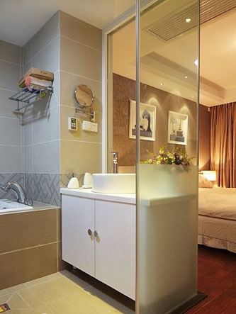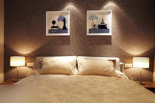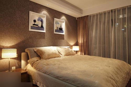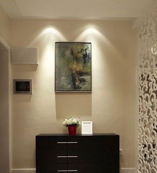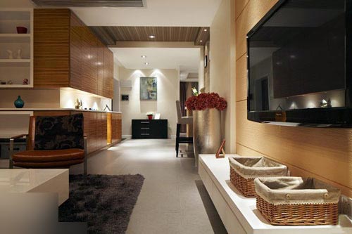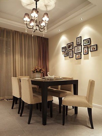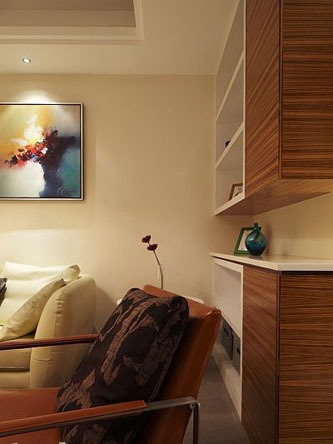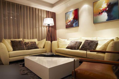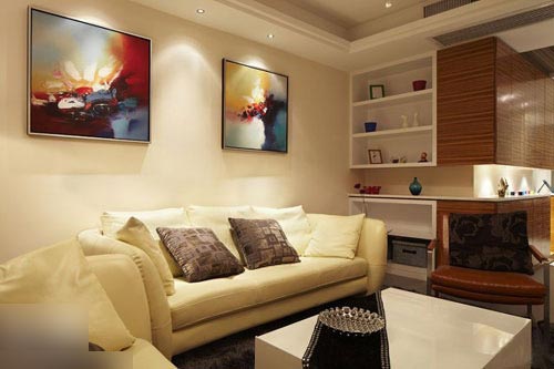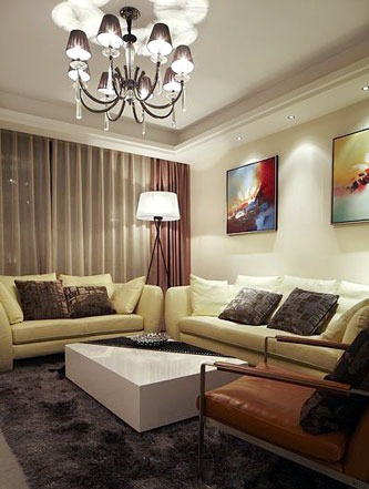 一進(jìn)房間,整個空間給人一種清爽不失高貴的感覺。客廳區(qū)域墻面沒有做過多的裝飾,墻面采用米黃色的油漆,客廳的吊頂也沒有做的太復(fù)雜只是在墻的邊角走了一圈邊,做成上下疊級的吊頂,并配上水晶吊燈,奶油色的布藝沙發(fā)搭配深色靠墊,既簡單又富有現(xiàn)代感。一個漂亮的落地?zé)粽樟琳麄€房間又起到了很好的裝飾做用,一舉兩得。沙發(fā)背景墻沒必要做的復(fù)雜,掛上兩幅簡單油畫,現(xiàn)代感極強。