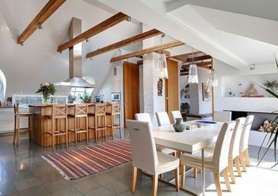 廚房和餐廳分列大空間的兩側(cè),全開放型的格局在保證了整體空間視覺通透的同時(shí),也增添了家的溫馨和情調(diào)。中間一塊彩條圖案的地毯,除了能渲染家居的生活氣息和趣味之外,也是作為隱形隔斷將兩個(gè)功能區(qū)劃分開來(lái)。