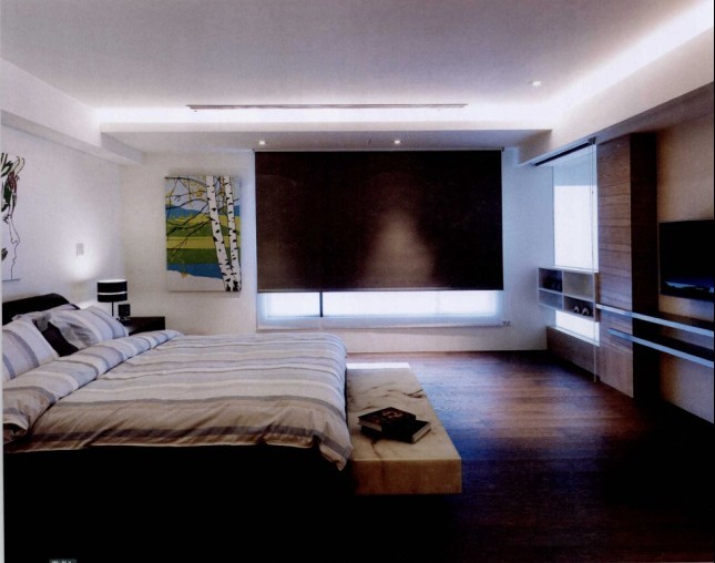 主臥規(guī)劃在樓上,包含了更衣室及專用浴室。為維持一貫的簡(jiǎn)潔,設(shè)計(jì)師特別設(shè)計(jì)了造型電視墻并連接展示層板。為了保證睡眠空間良好的睡眠氛圍,窗簾飾品采用深色系,可以很好的阻隔室外光線。