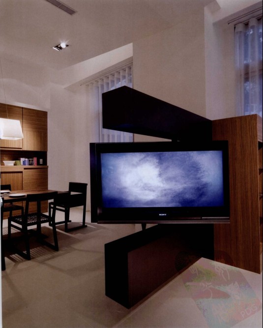 為維持開放式的空間感,設(shè)計師特別規(guī)劃了旋轉(zhuǎn)式的電視柜,讓客廳與餐廳都能看電視。造型突出的開放柜,不僅僅可以用來收納客廳的視聽音響設(shè)備。又成為客廳最搶眼的裝飾展示柜。
