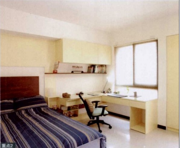 兩間緊的小孩房,讓兩兄弟可以一同生活但又各自的空間。大兒子的房間以閱讀為主,窗前的L形書桌連接柜體,除了放置書籍外,書桌下方還設(shè)計了展示空間,用來擺放收藏的玩具。