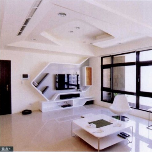 偌大的空間以白色為主色,避免空間過(guò)于單調(diào),設(shè)計(jì)師特別設(shè)計(jì)了個(gè)性化的電視柜,并以對(duì)稱(chēng)的天花板作為呼應(yīng),成為空間視覺(jué)的焦點(diǎn)。造型別致的電視培與客廳的簡(jiǎn)約茶幾沙發(fā)相搭配為我們營(yíng)造一個(gè)簡(jiǎn)約又不失時(shí)尚感的客廳。