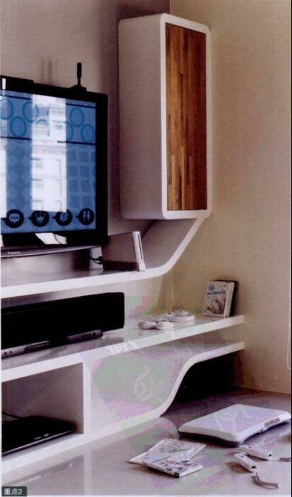 喜歡視聽(tīng)的業(yè)主,CD 、DVD片的數(shù)量絕對(duì)不會(huì)少。設(shè)計(jì)師在電視墻上規(guī)劃造型展示層架,不但收納功能不減,也兼顧了美感,而下方的開(kāi)放柜則用來(lái)收納游戲機(jī)。
