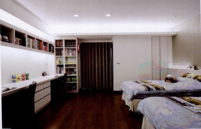 概要: 本案中的業(yè)主有兩個(gè)正在讀小學(xué)的孩子,業(yè)主在家居設(shè)計(jì)時(shí),除了風(fēng)格的營(yíng)造外,功能相對(duì)重要。設(shè)計(jì)師讓色彩單純化,把設(shè)計(jì)重點(diǎn)放在收納功能上。兩個(gè)女孩,設(shè)計(jì)師以一間大的小孩房讓兩個(gè)女孩共同生活,擴(kuò)大生活空間的同時(shí),也增加了收納面積,為小女孩打造高效率的收納空間 兩個(gè)女兒正是讀書階段,因此女兒房的閱讀空間的打造相對(duì)重要,而收納則以書籍為主,利用書桌吊柜上下空間及延伸的落地書柜收納書籍,使空間整潔、利落,也讓小孩讀書更有效率。