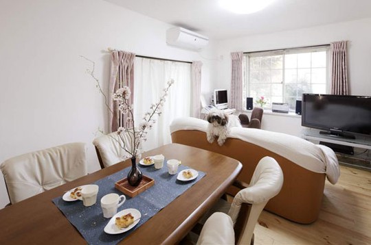 不同以往的選用乳白色皮質(zhì)座椅來搭配房間的原木地板,調(diào)和房間顏色的同時(shí)增加了房間的柔和度。配合著客廳淺粉色的窗簾,瞬間讓房間變得高雅無比。