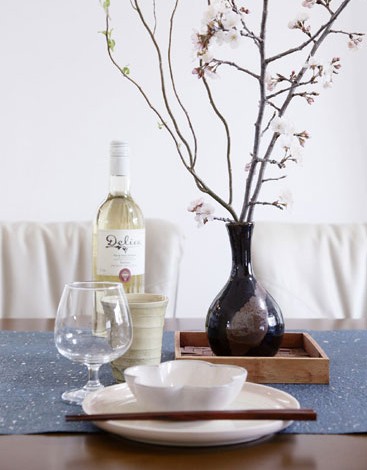 藍(lán)色桌布讓人覺得淳樸,木質(zhì)托盤與深棕色的花瓶營造出一絲舊時(shí)回憶的味道,也頗具民族特色。一株新采來的花枝帶給人希望,同時(shí)把餐廳變得典雅。一瓶洋酒,一只高腳杯,在雅致的頗帶民族味道的餐廳中,成功融入了現(xiàn)代的元素,更有一番別致的風(fēng)情。