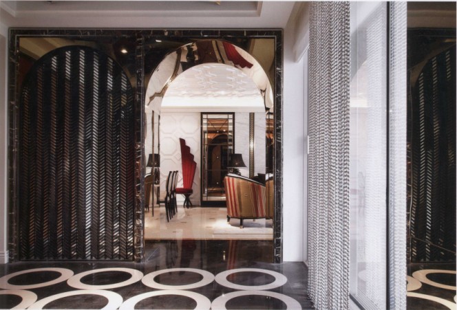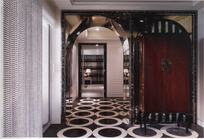 黑底白圈的地坪延伸到起居室。不銹鋼鏡面的傘狀天花,左右對(duì)稱的黑金花、金色鍍鈦板拱型穿廊和窗花,使軸線變得方正,也讓玄關(guān)形成正式的迎賓空間。