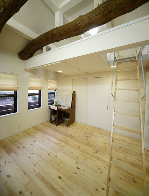 由于二樓的樓層較高,屋主更在另一房間內(nèi)搭建了一個(gè)小閣樓,同樣用原木作欄桿及橫梁,使房間增添不少樂趣。