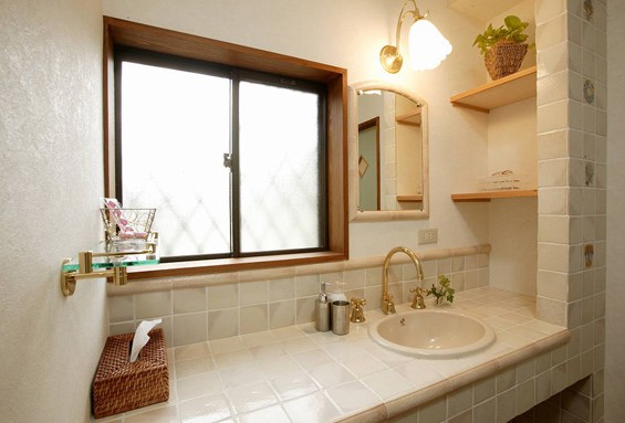 洗手臺(tái)采用花磚裝飾,顯得素雅別致。