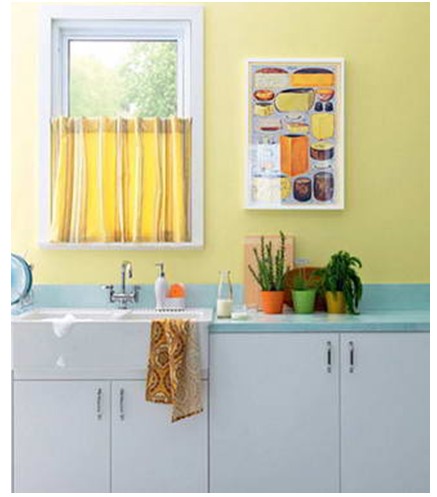 一談到廚房,就讓人聯(lián)想到油煙、閉塞、呆板之類的詞。想要讓不大的廚房輕松起來的話,試試選用淡黃色作為廚房墻面,搭配淺藍(lán)色的櫥柜臺面,瞬間廚房就明亮又從容起來。