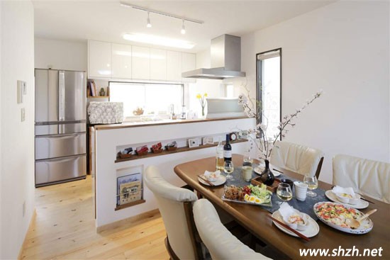這里是開放是的廚房及用餐區(qū)域,對(duì)于小戶型是節(jié)約空間的最好的方法,白色和淡褐色的顏色為主色調(diào),讓我們能夠放松心情。褐色木質(zhì)的長桌,搭配白色皮質(zhì)的椅子,餐桌上的一株梅花,淡淡的粉色,更飄散出甜美之感,并且深藍(lán)色的桌簾,白色的小點(diǎn)點(diǎn)點(diǎn)綴,猶如一片星空,浪漫溫馨。將簡約的田園氣息及歐式風(fēng)格浪漫風(fēng)情表現(xiàn)的淋淋盡致。