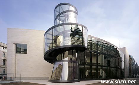 從上圖看德國歷史博物館與天空的距離很近,幾乎快要接觸的感覺。我們可以很清楚的看到螺旋式樓梯的玻璃中心柱蜿蜒在三個樓層之間,看上去就像是一個透明的蝸牛殼,透過玻璃,我們可以看到里面有比較簡單的裝修設計與裝修擺設。在每一個樓層,走廊就像露臺一樣伸進雄偉的玻璃大廳,每一個玻璃大廳的圓頂以巨大的弧形凸出,在平時一般被遮擋住的大樓的整個邊上形成了拱形。螺旋的樓梯旁邊的博物館就像一個巨大的玻璃柜,他們是由玻璃、鋼筋與砂石組成的吸引觀眾的磁鐵--這也是德國第一個貝聿銘作品。貝聿銘,這位“光線魔術師”,在巴黎為盧浮宮建造了玻璃金字塔,在華盛頓為國家美術館設計了引起轟動的東館。
