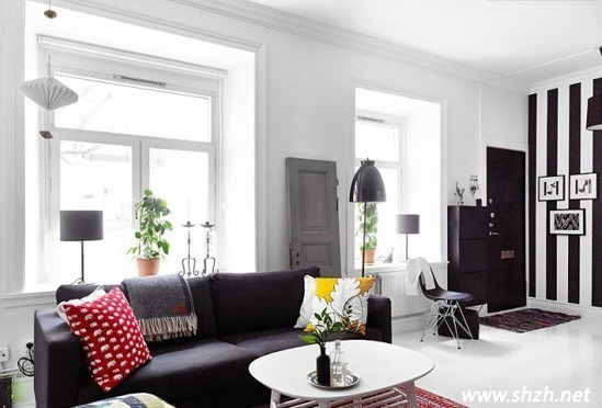 從客廳的側(cè)面放眼望去,客廳的整體空間的主色調(diào)自然是以白色為底,黑色為輔,選用以黑色為主的家具和裝飾品的選擇搭配,再者簡(jiǎn)單的紅白搭配的抱枕及地毯也成為客廳的亮色之一,并且活躍了空間的活力氛圍。使得整個(gè)客廳散發(fā)著時(shí)尚氣息,同時(shí),這種混色搭配避免了模式化的冰冷房間,多了一份家的溫馨感。