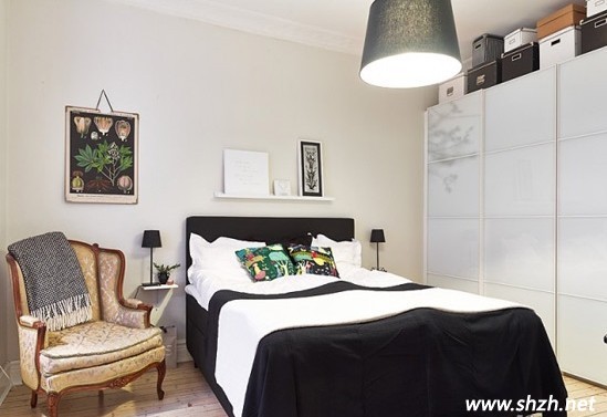 床頭墻壁上的水粉風(fēng)景裝飾畫將大自然帶進(jìn)了臥室,和墻壁上擱板上擺放黑白色調(diào)的裝飾品很和諧的形成了一處風(fēng)景。臥室的地板采用的是最原始色的木材地板鋪成的,我們可以看到樹木自然的紋理都被保留了下來,使我們?nèi)谌肓舜笞匀坏膽驯В⑶曳路疬€能聞到樹木散發(fā)出的清香氣味,給人舒適、清新、快樂、溫馨的感覺,臥室的這種裝飾便于提高我們的睡眠質(zhì)量。白色的衣柜邊上有淡淡的樹枝暗影,很特別的設(shè)計(jì),像是從那副風(fēng)景畫上倒影過來的,給人一種身處林間,光影交錯(cuò)的錯(cuò)覺感。