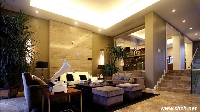 大家再跟著小編想四周墻面和地面上看去,兩者的材質(zhì)采用的都是大理石,再加上燈光的照射讓墻壁和地面顯得非常有光澤??蛷d內(nèi)擺放的體積比較大的綠色植物盆栽,讓整個(gè)客廳不僅有著古典歷史文化的氛圍,而且也體現(xiàn)出了客廳的自然樸實(shí)的氣息。